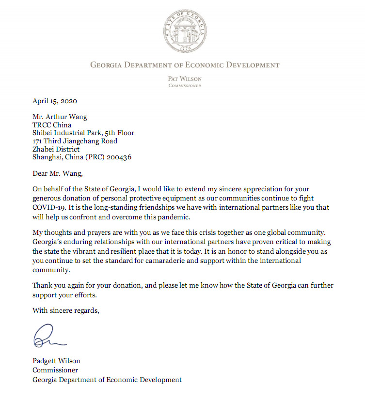 ]]>The post 美國佐治亞州經(jīng)濟(jì)發(fā)展署署長致謝王閩先生的個(gè)人防護(hù)裝備捐贈(zèng) appeared first on 綈亞希西紡織橡膠(連云港)有限公司.